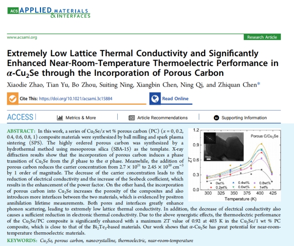 量子关联物质研究团队青年博士赵小蝶在半导体热电材料领域取得重要进展,研究成果发表在《ACS Applied Materials & Interfaces》(IF=9.5,中科院二区TOP),论文题目为“Extremely Low Lattice Thermal Conductivity and Significantly Enhanced Near-Room-Temperature Thermoelectric Performance in α-Cu2Se through the Incorporation of Porous Carbon”。BBIN