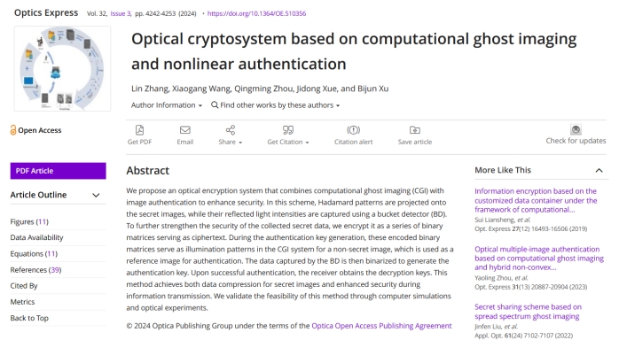 应用物理系2021级研究生张琳同学以第一作者身份在光学领域知名学术期刊《Optics Express》(影响因子3.8,中科院二区Top)上发表了题为“Optical cryptosystem based on computational ghost imaging and nonlinear authentication”的研究论文,BBIN