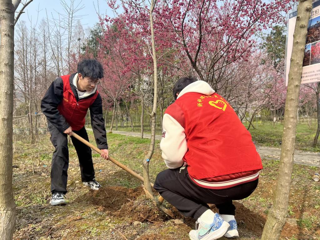 在植树活动现场,众位志愿者肩担铁锹,双手稳持树苗,努力深挖树坑,细心倾注水源,滋润土壤。值得一提的是,志愿者中包含来自泰国、土耳其、摩洛哥、喀麦隆、柬埔寨等5个国家的六七名留学生。在17位志愿者的努力下,小和山社区公园再添数株新绿。
