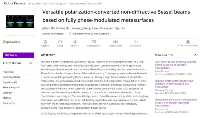 光子与光场调控研究团队2021级研究生职佳浩同学以第一作者身份在光学领域知名学术期刊《Optics Express》(影响因子3.8,中科院二区Top)上发表了题为“Versatile polarization-converted non-diffractive Bessel beams based on fully phase-modulated metasurfaces”的研究论文。BBIN