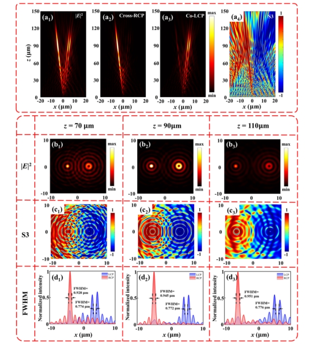 图 左旋圆偏振光入射下产生正交圆偏振双贝塞尔光束的超表面模拟结果。