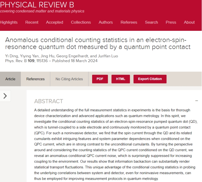 与罗马尼亚巴比什-博雅依大学联合培养博士研究生丁一同学以第一作者在国际权威物理学术期刊《Physical Review B》上发表了题为"Anomalous conditional counting statistics in an electron-spin-resonance quantum dot measured by a quantum point contact”的研究论文,物理系骆钧炎教授为论文通讯作者,颜益营副教授、南方科技大学Georg Engelhardt副研究员为共同指导教师。《Physical Review B》是由美国物理学会(American Physical Society)主办的学术期刊之一,影响因子3.908,中科院二区TOP期刊,是凝聚态物理方面最有影响力和最权威的期刊之一,也是自然指数(Nature Index)收录的全球82个顶级期刊之一。