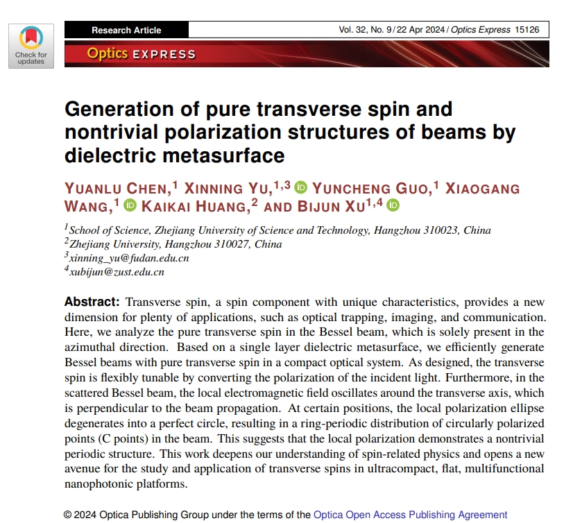 光子与光场调控研究团队中2021级研究生陈远路以第一作者身份在《Optics Express》期刊上发表了题为“Generation of pure transverse spin and nontrivial polarization structures of beams by dielectric metasurface”的创新研究文章。BBIN