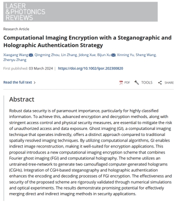光子与光场调控研究团队在光信息安全处理研究领域取得重要进展,相关研究成果以“Computational Imaging Encryption with a Steganographic and Holographic Authentication Strategy”为题,发表于光学领域国际顶尖期刊《Laser & Photonics Reviews》(影响因子11,中科院1区Top),并被选为当期的扉页论文(Frontispiece)高亮推荐。汪小刚教授、物理系2021级硕士研究生周清明为本文的共同第一作者,汪小刚教授、徐弼军教授为论文的共同通讯作者。BBIN