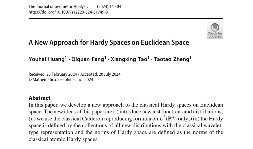 近日,实分析与调和分析及应用团队在J. Geom. Anal. 上发表了题为“A New Approach for Hardy Spaces on Euclidean Space”的研究论文。此论文BBIN