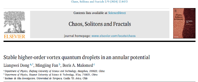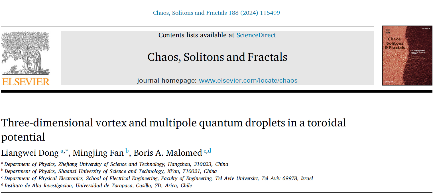 非线性物理团队在量子液滴演化动力学领域取得重要进展,相关研究成果以“Three-dimensional vortex and multipole quantum droplets in a toroidal potential”为题,发表于非线性物理国际权威期刊《Chaos Solitons & Fractals》(中科院大类一区)。董亮伟教授为第一兼通讯作者,BBIN
