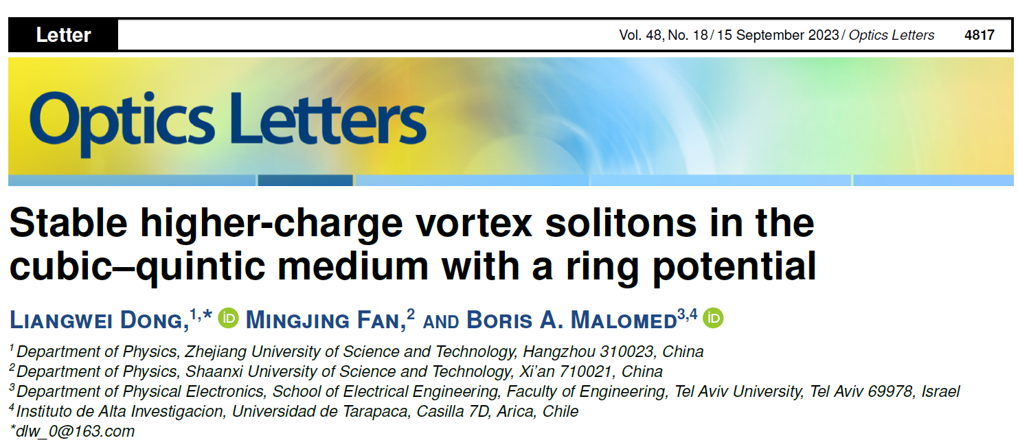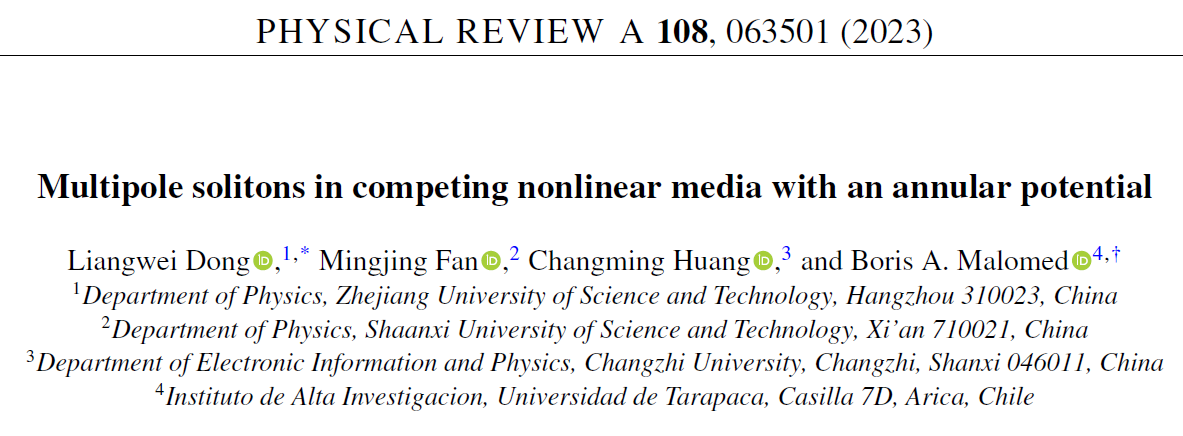 为论文第一单位。第二作者为范明晶硕士,第三作者为非线性科学领域著名科学家以色列特拉维夫大学Boris A. Malomed教授。