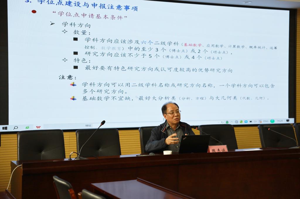 邀请浙江师范大学杰出教授、国家级人才、浙江省登峰学科和浙江省基础学科负责人陈杰诚教授作题为“数学学位点与学科建设的一点体会”的主题报告,副校长侯北平莅临现场并主持报告,侯副校长在会前还与陈教授进行了交流。BBIN