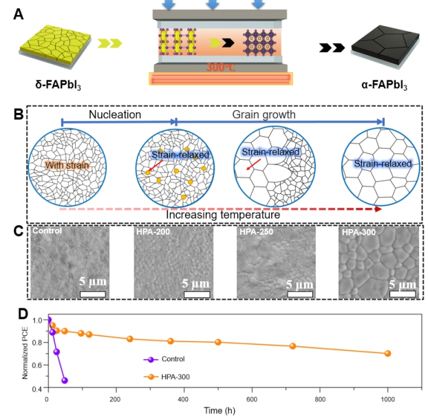 有机无机杂化卤化物钙钛矿太阳能电池(PSC)因其低制备工艺简单、成本低及高光电转换效率而备受关注。在金属卤化物钙钛矿中,α-FAPbI3因其合适的带隙宽度和较好的热稳定性而成为制备高效、稳定钙钛矿太阳能电池的理想候选材料。然而,高质量的无掺杂α-FAPbI3薄膜的制备仍然存在一定的挑战。该工作报道了通过高温热压辅助重结晶策略,在没有任何掺杂剂的情况下生长出稳定相纯α-FAPbI3薄膜。高温可以促进纯相α-FAPbI3的形成,通过重结晶过程释放钙钛矿薄膜中的应力并增大了钙钛矿薄膜晶粒。同时压力形成的限域空间有效防止了钙钛矿在高温下有机成分的挥发。基于此,最终制备的钙钛矿太阳能电池的光电转换效率高达24.06%,在85℃和85% 相对湿度下1000小时后,仍能保持其初始效率值的70%以上(图2)。