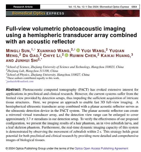 光子与光场调控研究团队在光声成像研究领域取得进展,相关研究成果以“Full-view volumetric photoacoustic imaging using a hemispheric transducer array combined with an acoustic reflector”为题,发表于光学领域期刊《Biomedical Optics Express》(影响因子2.9,中科院2区)。BBIN