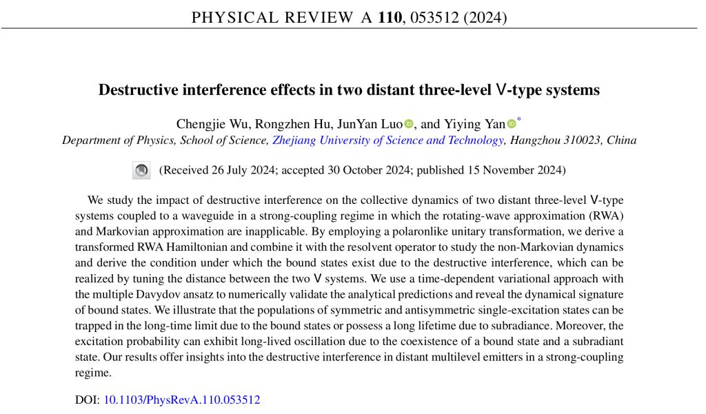 量子信息物理研究团队在量子光学领域取得重要进展,研究成果“Destructive interference effects in two distant three-level V-type systems”在物理学国际学术期刊《Physical Review A》(IF=2.6,中科院二区)上发表。该研究由BBIN
