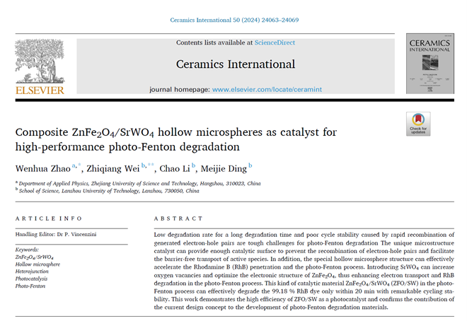 量子关联物质研究团队在“能源材料光催化降解污染物”研究中取得重要进展,研究成果以论文形式发表在国际期刊《Ceramics International》上(IF: 5.1,中科院二区),论文题目为《Composite ZnFe2O4/SrWO4 hollow microspheres as catalyst for high-performance photo-Fenton degradation》。青年博士赵文华为该论文的第一作者和通讯作者,BBIN