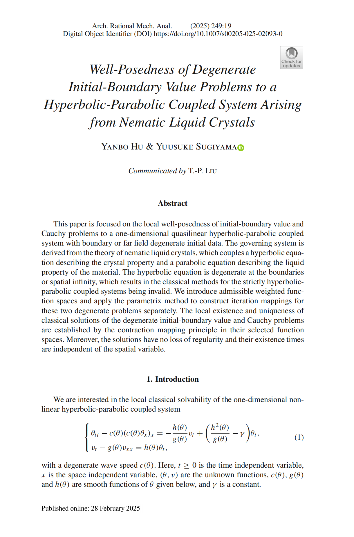 近日,非线性偏微分方程团队胡燕波教授与日本The University of Shiga Prefecture的Yuusuke Sugiyama教授合作,在Archive for Rational Mechanics and Analysis(理性力学与分析档案,简称ARMA)上发表了题为“Well-Posedness of degenerate initial-boundary value problems to a hyperbolic-parabolic coupled system arising from nematic liquid crystals”的研究论文,全文66页。该论文胡燕波教授为第一作者,BBIN