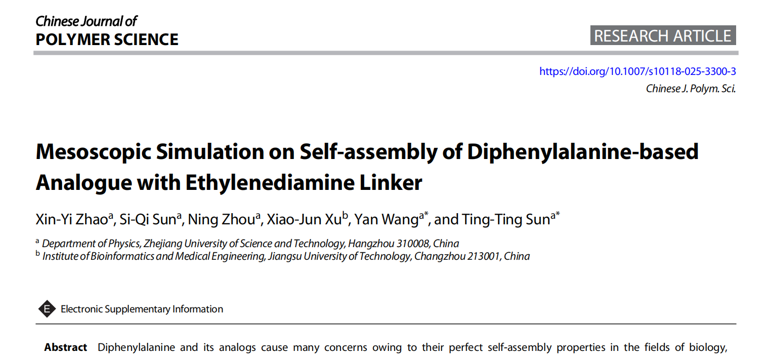 软物质与功能纳米材料研究团队在“短肽衍生物自组装领域”取得重要的研究进展,相关研究成果以浙江科技大学为第一单位在国际期刊《Chinese Journal of Polymer Science》(IF = 4.1,中科院SCI二区,JCR Q1)上,在线发表题目为“Mesoscopic Simulation on Self-assembly of Diphenylalanine-based Analogue with Ethylenediamine Linker”的论文。物理学硕士研究生赵欣怡为该论文第一作者,应用物理系王艳博士和孙婷婷教授为共同通讯作者,BBIN