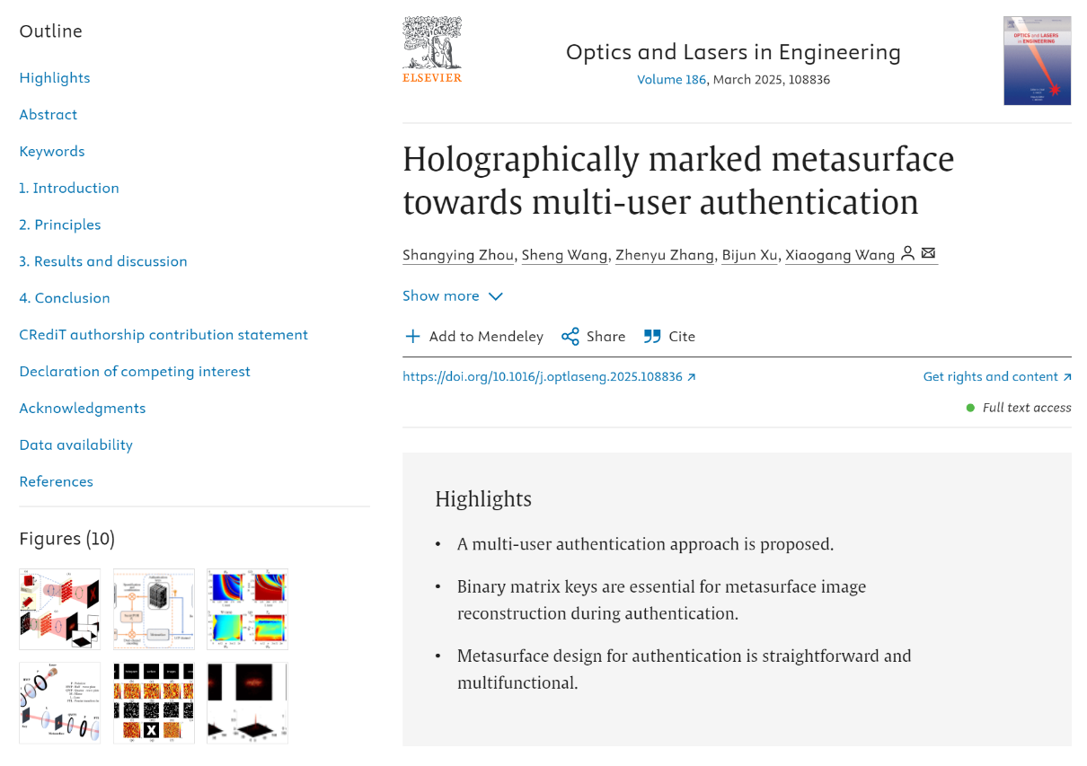近年来,以超表面为基础的图像加密在光学安全领域的热度不断攀升,正渐渐成为引人注目的研究热点。但与之形成强烈反差的是,当前对基于超表面的图像认证所给予的关注极为有限。此次发表于《Optics and Lasers in Engineering》的研究成果提出了一种基于偏振复用技术且具备全息标记的超表面方案。该方案通过巧妙运用不同的偏振通道,把全息标记嵌入到超表面里。这一新方法不但让不同超表面的辨别得以简化、减少了被攻击者关注的可能性,而且顺利实现了多图像认证的功能。(应用物理系 孙婷婷 学科办 陈璟)