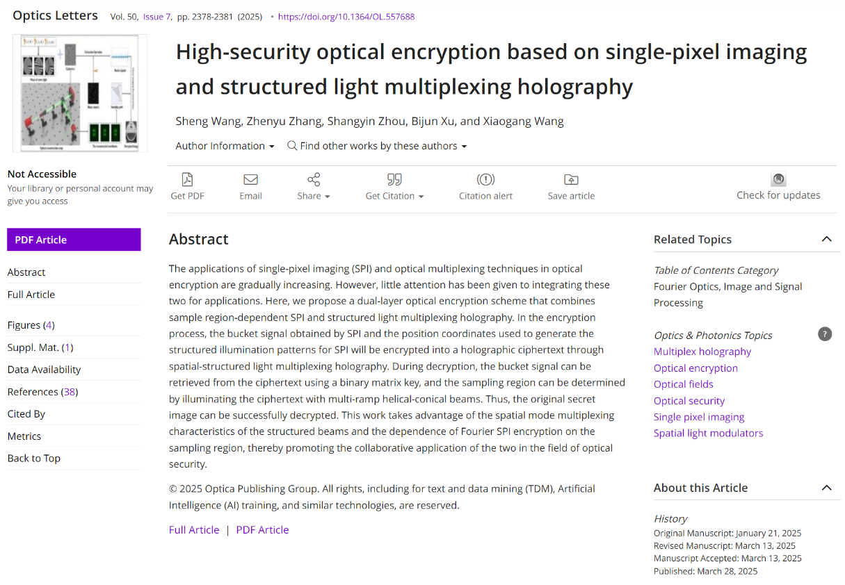 光子与光场调控研究团队汪小刚教授的指导下,应用物理系2022级研究生汪晟同学以第一作者的身份,在光学领域著名学术期刊《Optics Letters》(影响因子3.1,JCR一区、中科院二区)发表了题为“High - security optical encryption based on single-pixel imaging and structured light multiplexing holography”的研究论文。同期,应用物理系2022级研究生周尚营同学也以第一作者身份,在工程技术领域知名学术期刊《Optics and Lasers in Engineering》(影响因子3.5,JCR一区、中科院二区)发表了题为“Holographically marked metasurface towards multi - user authentication”的研究论文。以上两篇论文的第一署名单位均为BBIN