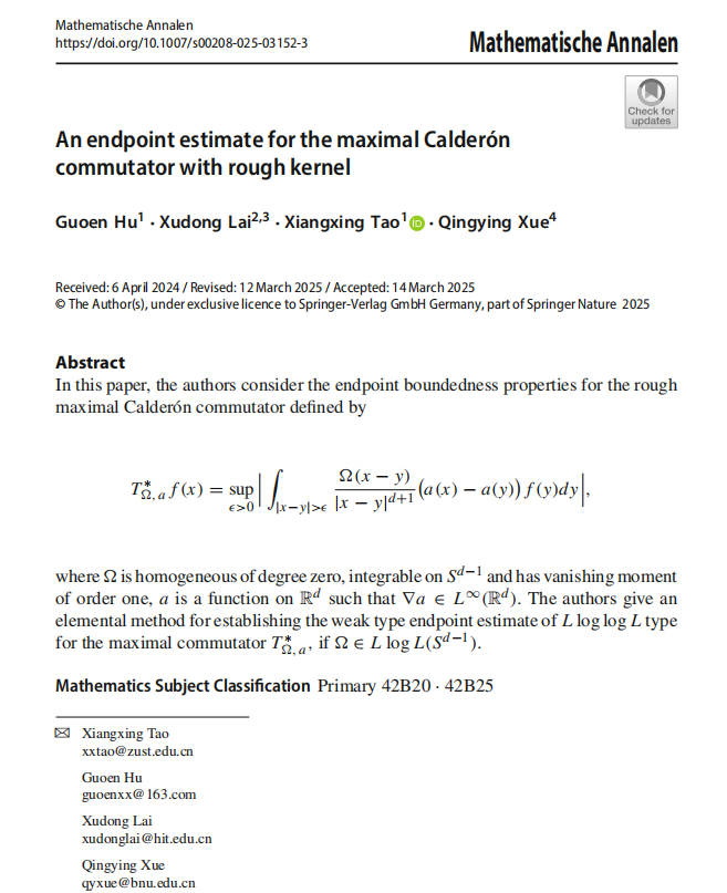 近日,实分析与调和分析及应用团队胡国恩教授、陶祥兴教授与合作者在数学领域著名的德国数学年刊《Mathematische Annalen》上发表了题为“An endpoint estimate for the maximal Calderón commutator with rough kernel”的研究论文,全文35页。此论文胡国恩教授为第一作者,陶祥兴教授为通讯作者,BBIN