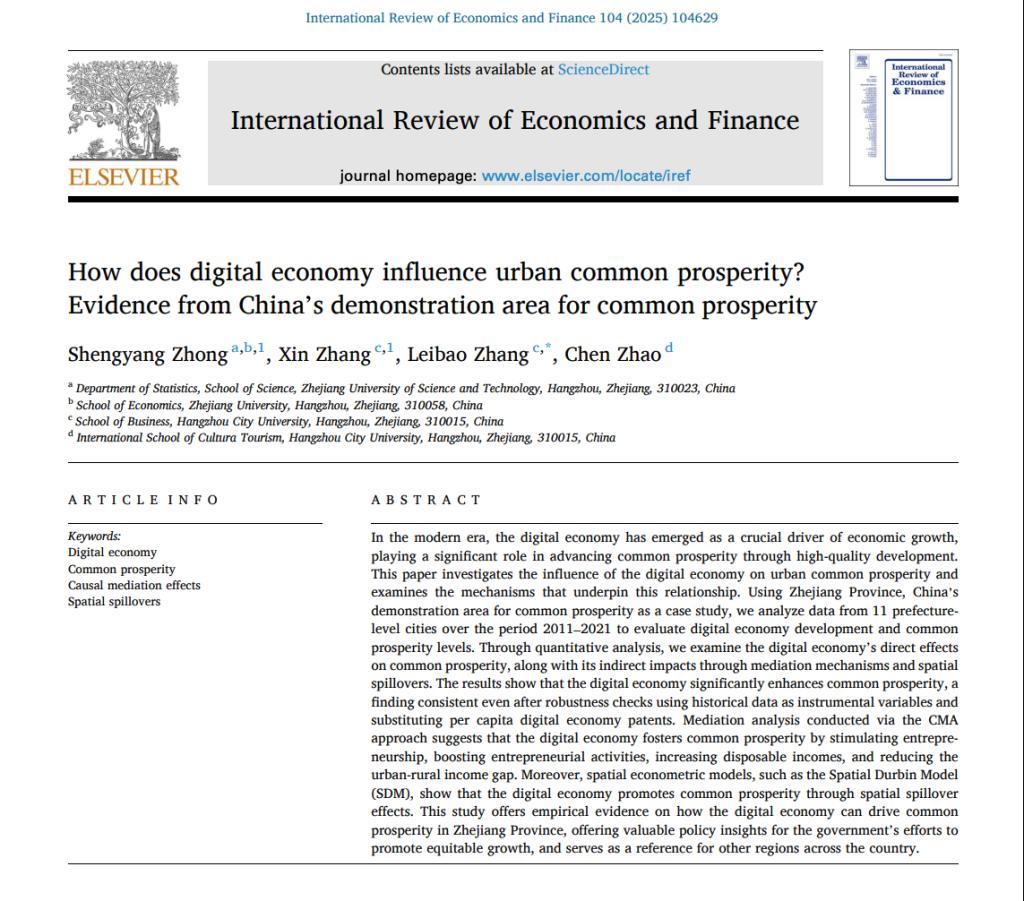近日,应用统计与金融数学团队钟声扬博士与合作者在经济/金融领域权威期刊《International Review of Economics and Finance》上发表了题为“How does digital economy influence urban common prosperity? Evidence from China’s demonstration area for common prosperity”的研究论文。此论文钟声扬博士为第一作者,BBIN