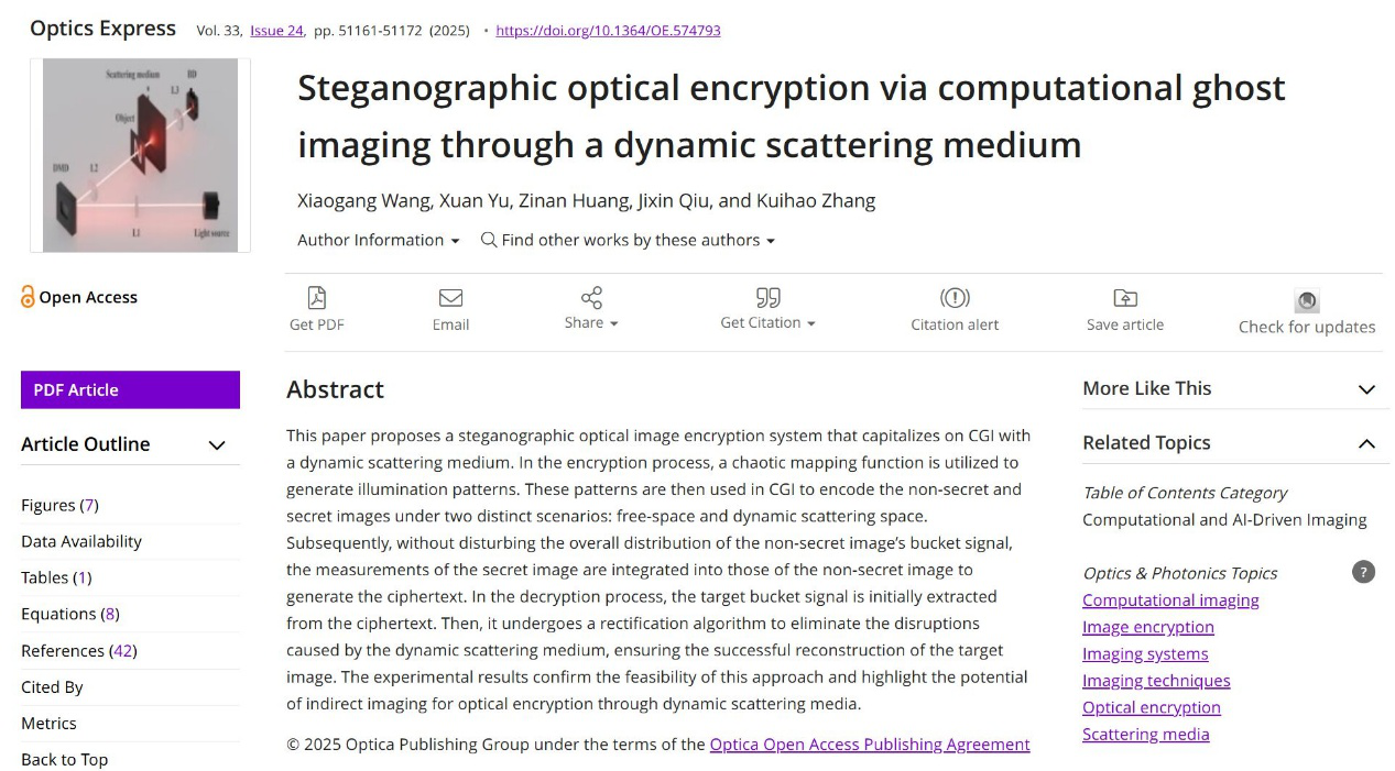 同期,光子与光场调控研究团队在光学领域知名学术期刊《Optics Express》(影响因子3.3,JCR一区、中科院二区)发表了题为“Steganographic optical encryption via computational ghost imaging through a dynamic scattering medium”的研究论文。该成果提出了一种利用动态散射介质结合计算鬼成像的隐写式光学加密系统。加密过程中,分别在自由空间和动态散射空间两种场景下对非秘密图像和秘密图像进行编码。接着,在不干扰非秘密图像桶信号整体分布的前提下,将秘密图像的测量数据融入非秘密图像的测量数据中,从而生成密文。解密阶段,先从密文中提取目标桶信号,再通过校正算法消除动态散射介质造成的干扰,确保目标图像成功重建。实验结果验证了该方法的可行性。该工作凸显了基于动态散射介质的间接成像技术在光学安全领域的应用潜力。BBIN