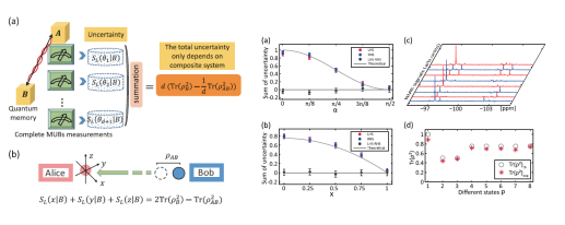 最近,基于Zeilinger的信息度量方式,王恒岩与其合作者得到了纠缠辅助下的无偏测量的不确定关系。理论结果发现,如果考虑到量子纠缠,那么在子系统无偏测量下的不确定度之和是一个确定的数,仅与系统初始状态相关。并且,王恒岩与其合作者设计了巧妙的观测方法,在实验中直接实现了线性熵定义的不确定度的直接度量,进而利用五比特量子系统验证了包含纠缠的两体系统不确定关系的等式形式,其中采用的实验手段及数据处理方法对其他物理体系具有很好的适用性和扩展性。该工作在量子随机数生成等量子信息处理任务中有潜在的重要应用。