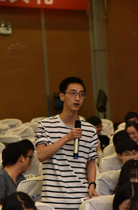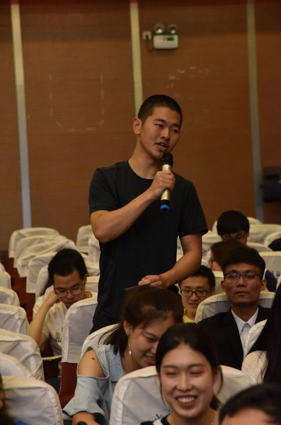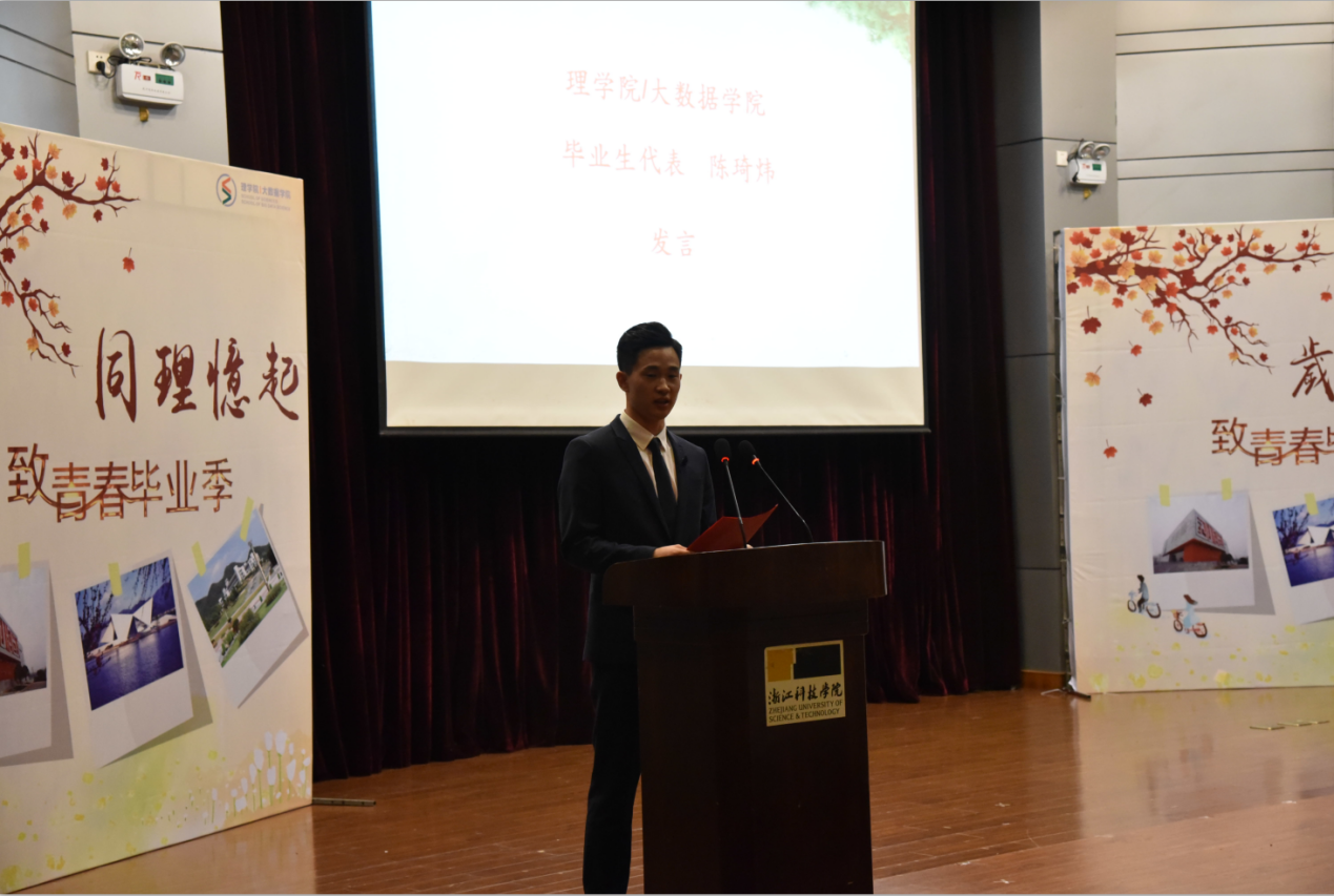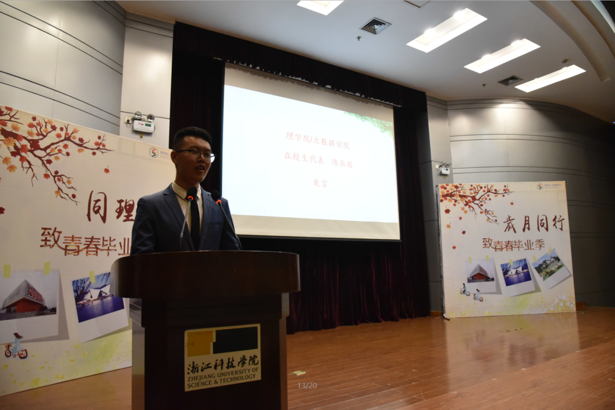 2018届学生会主席、信息与计算科学161班陈乐廷,作为在校生代表向毕业生表示感谢:“无论是刚开学时你们的接待,或是生活中你们的引领,还是学习上你们的指导,学长学姐们永远真诚、热情地帮助我们。是你们的不吝教导,带着我们成长;是你们的挺身而出,为我们遮风挡雨;是你们以身作则,带领我们勇往直前。谢谢各位学长学姐们的关爱,我们将永远铭记于心。”陈乐廷动情地说道:“总有一种力量让我们泪流满面,总有一种力量让我们精神抖擞,总有一种力量它驱使我们不断寻求‘止于至善’。这种力量来自在坐的每一位学长学姐。”最后陈乐廷向学长学姐们表达祝福:“海阔凭鱼跃,天高任鸟飞,祝愿学长学姐们在新的征程,创造新的辉煌!”