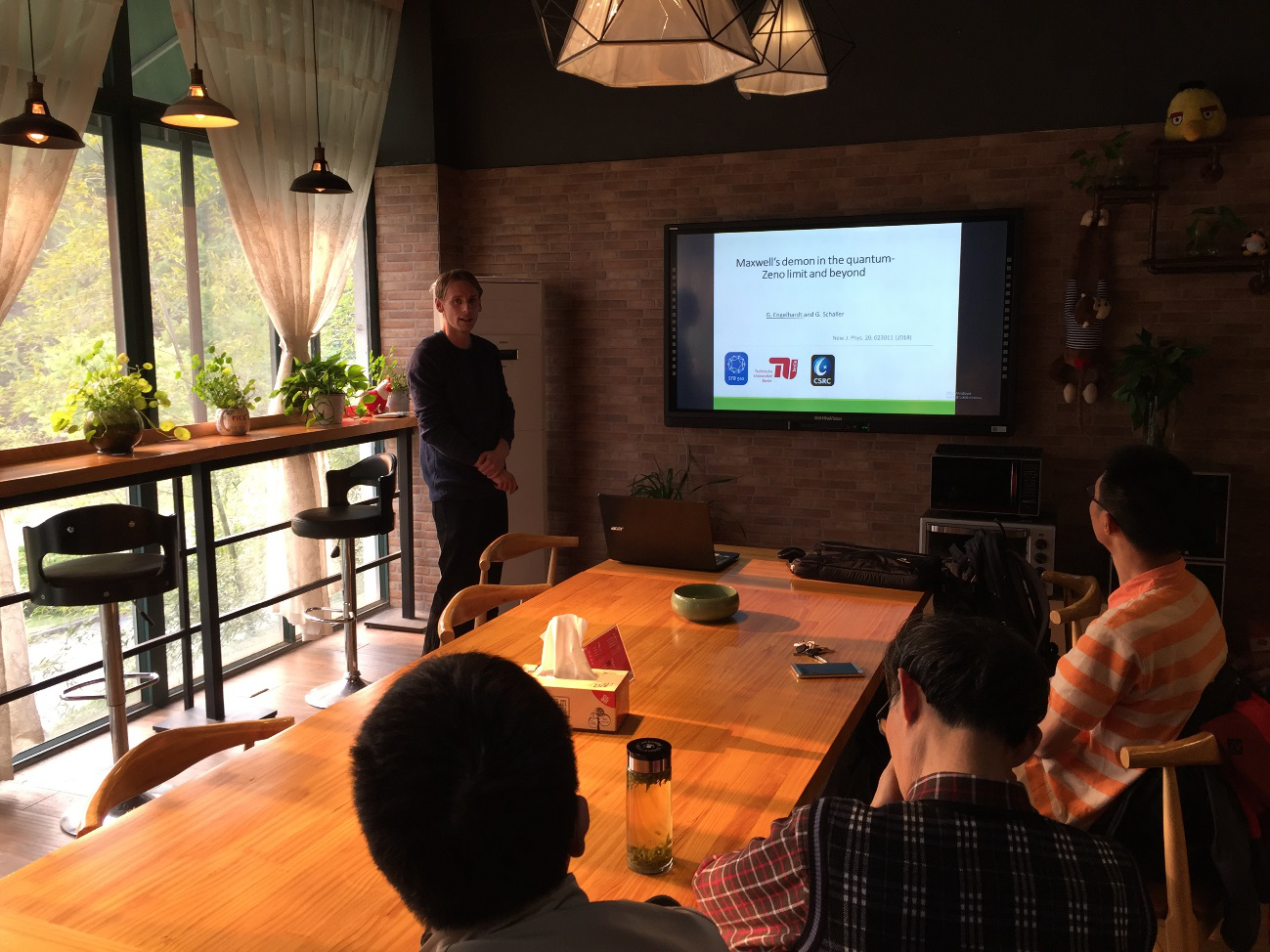 4月25日, 北京计算科学研究中心Georg Engelhardt博士应邀做客物理格致论坛第39期,做了题为“Maxwell's demon in the quantum-Zeno regime and beyond”的学术报告。此次报告由骆钧炎教授主持,BBIN
