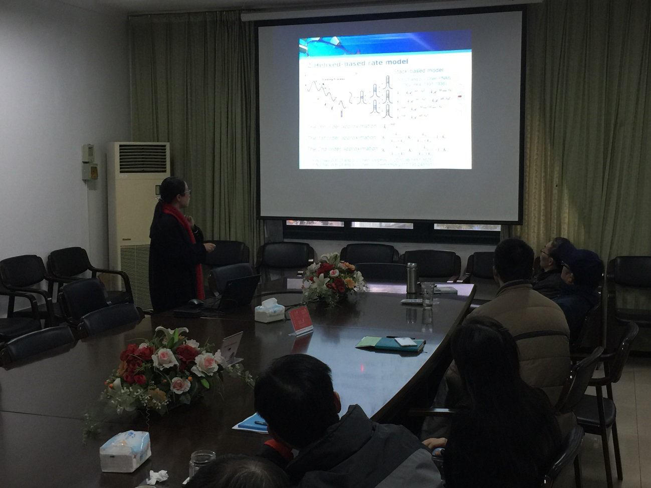 11月21日, 浙江工商大学孙婷婷副教授应邀做客物理格致论坛第34期,做了题为“Cotranscriptional folding kinetics of Riboswitch”的学术报告。此次报告由骆钧炎老师主持,BBIN