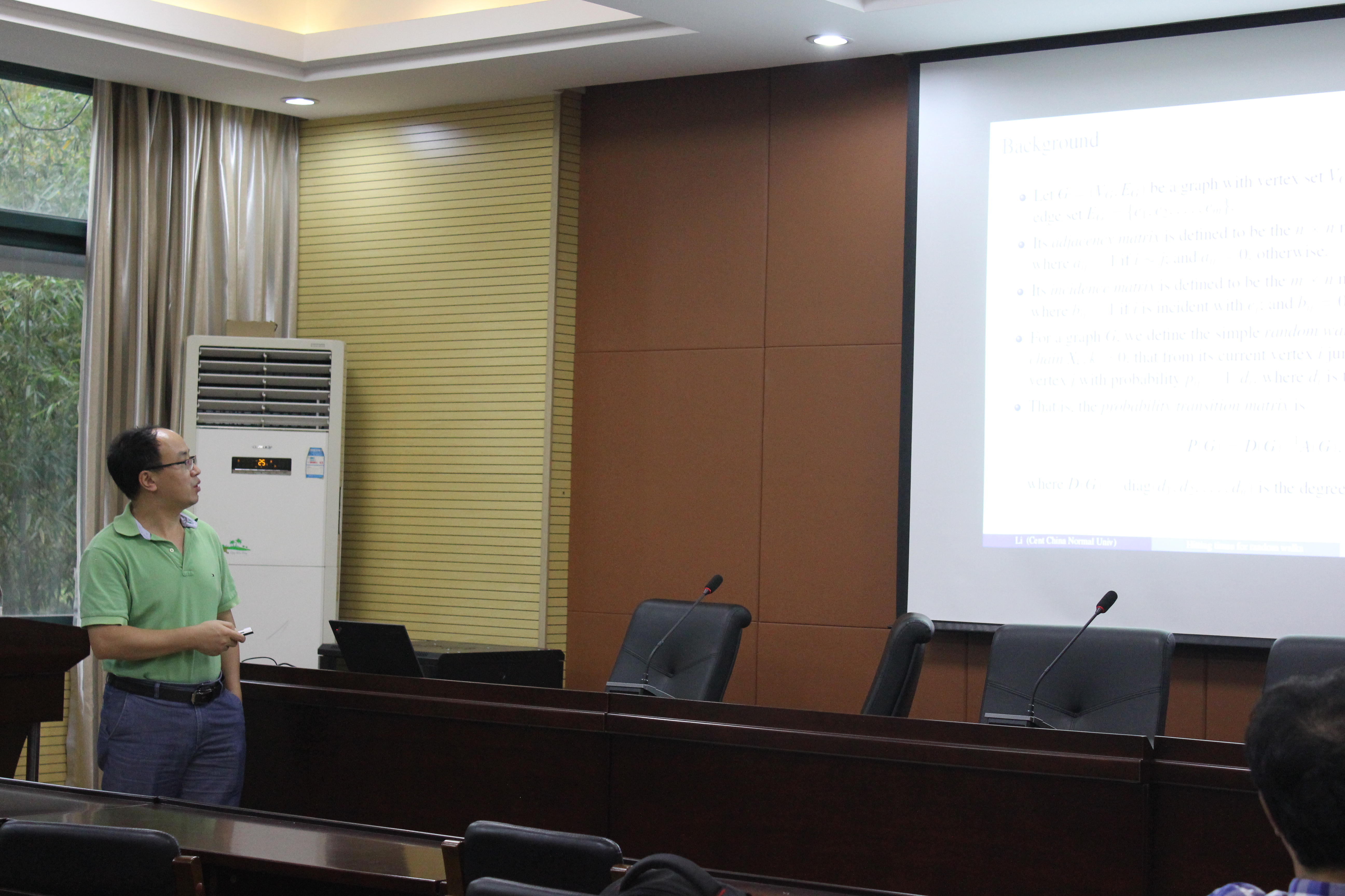 和山数学论坛136-138期,分别做了题为“Sharp bounds for spectral radius of nonnegative matrices”、“On the least signless Laplacian eigenvalue of a non-bipartite connected graph with fixed maximum degree”、“ Expected hitting times for random walks on quadrilateral graphs and their applications”的学术报告。报告由BBIN