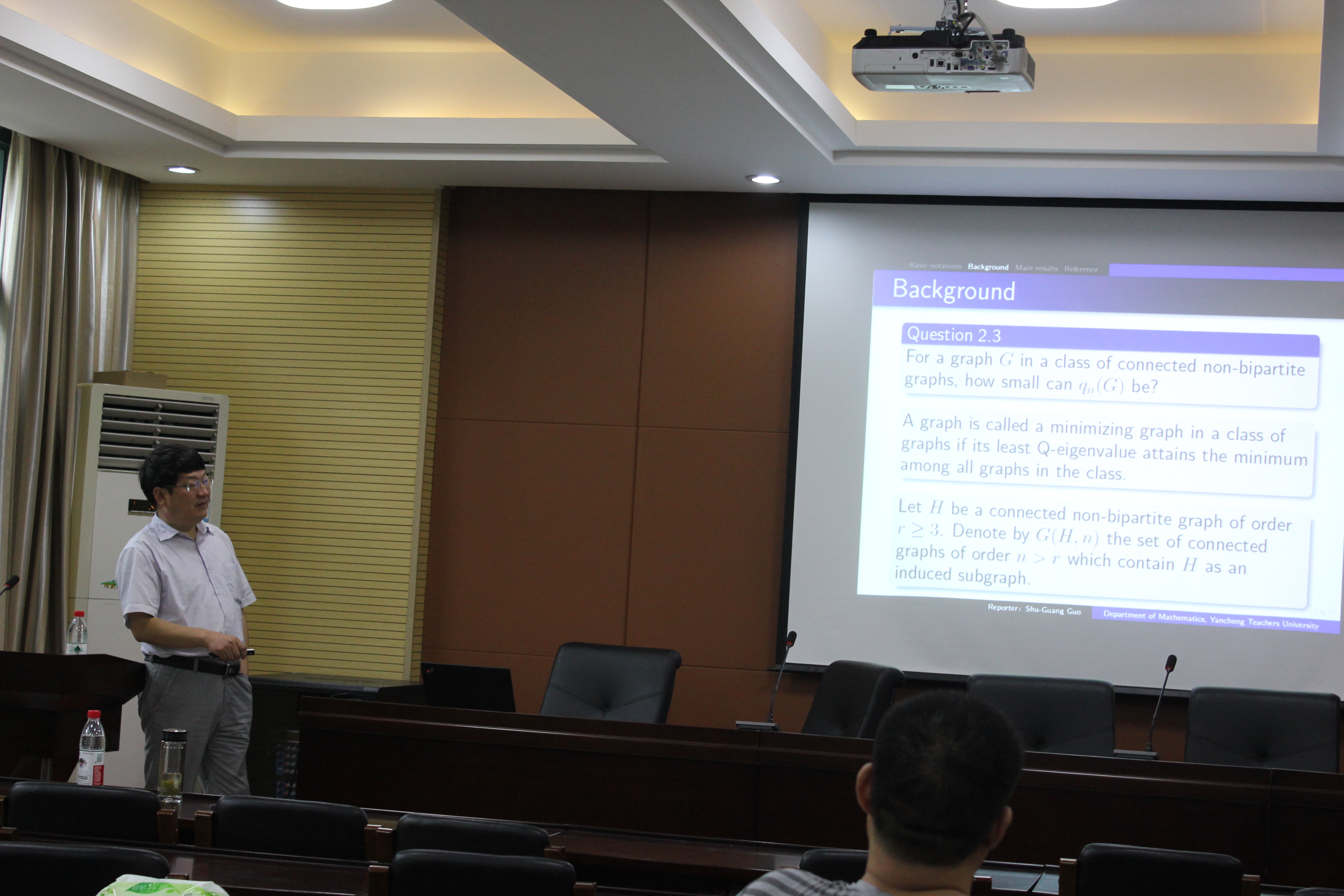报告中周波教授介绍了非负矩阵的谱半径的上下界问题,利用行矩阵元求和方法去探讨矩阵特征,并对自己的研究成果做了详细阐述;郭曙光教授介绍了一些特定的图以及其上的拉普拉斯最小特征值问题,同时介绍了在代数图论和组合数论等方面的最新研究成果;李书超教授介绍了图论的相关研究,定义一个连通图G,探讨了超图上随机问题,给出了最新的研究成果。报告结束后,三位教授与在场师生做了进一步的学术交流。