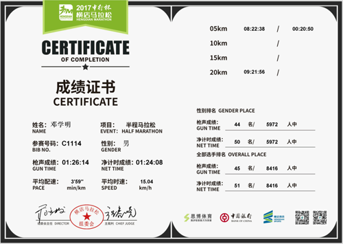 邓学明老师在这美丽的季节分别参加了两场马拉松比赛,并取得了优异的成绩。4月9日参加了2017“中行杯”横店马拉松男子半程比赛,枪响成绩1小时26分14秒,在5972名参赛选手中位列44名;净成绩1小时24分08秒,在5972名参赛选手中位列50名。4月23日参加了2017扬州鉴真国际马拉松男子半程赛,枪响成绩1小时22分13秒,在9764名参赛选手中位列57名;净成绩1小时22分05秒,在9764名参赛选手中排名58。值得庆贺的是这成绩在46岁到50岁的1768名参赛男子选手中排名第3,在有2012名选手参加的中国梦排名第10。