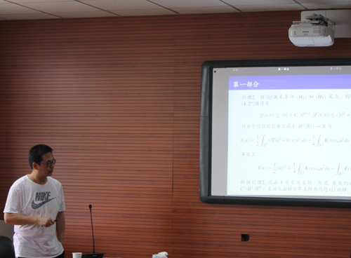报告中,王大斌老师为大家详细的讲解了三维空间上Schrodinger-Poisson方程,分数阶椭圆方程及一类调和方程解的存在性和多解性问题及其应用前景。