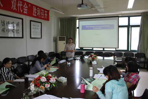 报告中,孙小春老师与大家一起讨论了Sobolev空间、Besov空间以及混合Besov空间上分数阶Navier-Stokes-Coriolis系统的整体与局部适定性;张继红老师为大家介绍了自己在随机分析及其应用方面所取得的一些研究成果。