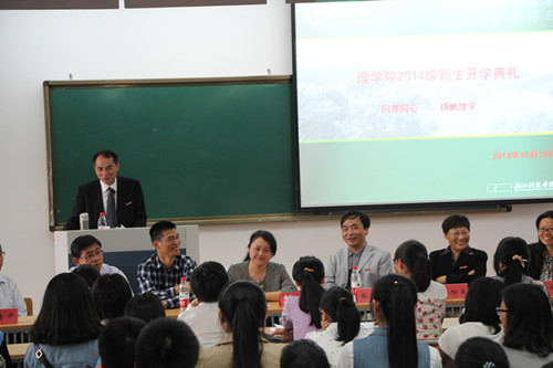 全体教职工欢迎新生加入理学大家庭。他从多角度阐释了大学与中学的区别,希望新生们尽快适应大学生活,通过四年的学习,努力把自己锻炼成为“厚基础、强应用、国际化”的有用之才。苗红亚也在会上发言,她认为进入大学,不仅仅是学知识,更是学做人。她希望新生们要明确学习目标,学会自我管理,学会自主学习,努力做到校党委提出的“七个一”。 两位系主任、老生代表、新生代表也在会上分别发言。