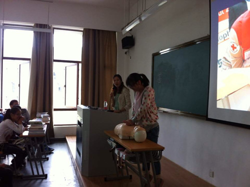 对于全球最为广泛的急救技术——心肺复苏,梁博士将其概括成为了一句话:“叫叫CAB”并对这句话做了最为简洁和精辟的解释。在梁博士一个多小时的精彩讲演中,现场气氛热烈,尤其在梁博士做胸外压示范动作时,同学们纷纷举手表示想要亲身体验,学习气氛达到高潮。