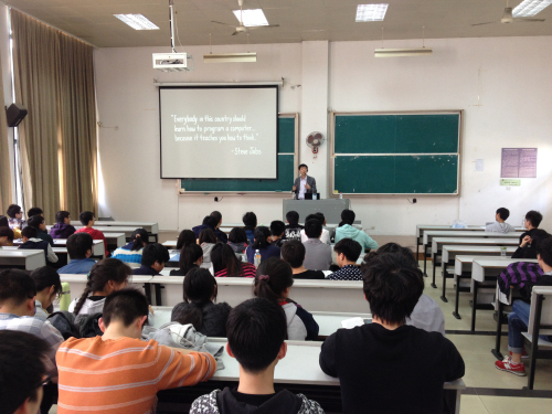 讲座主要围绕当前IT行业的发展、软件行业对大学生的需求、编程的重要性等方面展开。周羽用诙谐幽默的演讲方式,给学生们讲述了互联网时代的发展。他通过Facebook收购WhatsApp软件、Elon Musk的传奇经历等案例说明了现今各行业对软件的依赖性,IT行业已然成为21世纪颇有规模和广阔前景的新型产业,让学生深刻体会到了编程对于进军软件行业的重要性。