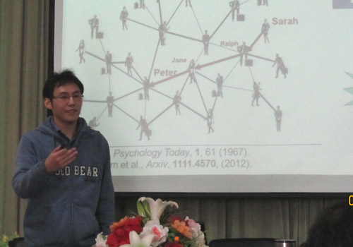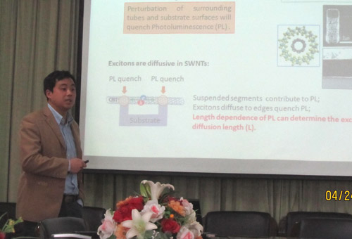 谢建平博士在报告中介绍了单壁碳纳米管的构造以及制造方法,阐述了单壁碳纳米管中激子的产生和猝灭过程,以及扩散长度的估算方法。傅晨波博士生在讲座中介绍了复杂网络和混沌同步等概念,重点阐述了复杂网络体系的增长,同步图样的界定以及拓扑控制。