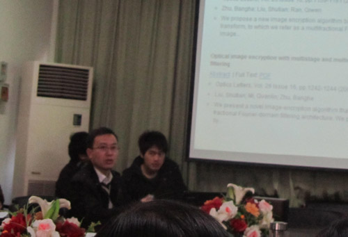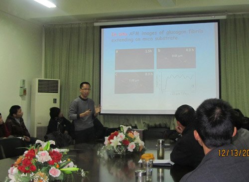 12月13日下午,BBIN 物理系“格致论坛”第十六讲在A4-222会议室举行。宁波大学周星飞博士和浙江农林大学汪小刚博士应邀为论坛作学术交流报告。报告会由物理系主任王长荣教授主持,物理系、实验中心相关教师和应用物理学部分高年级学生参加了本次论坛。 会上,汪小刚博士、周星飞博士分别就“光学图像的编码及隐藏”、 淀粉样多肽聚集的原子力显微镜研究作了专题报告,介绍了自己近年来在该的相关研究成果,并和与会师生就相关专题进行了讨论。