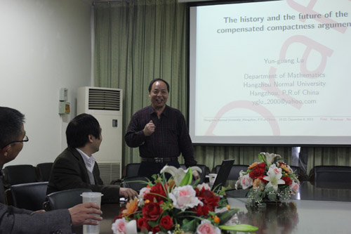 院士,曾主持中科院百人计划项目,浙江省特聘专家。近年来,陆教授一直活跃在双曲守恒方程(组)这一研究领域。本次报告中,陆教授介绍了补偿紧致理论在双曲守恒定律中的相关应用以及将来新的应用,并与大家分享了他本人在此领域的一些重要研究成果。报告结束后,与会教师纷纷与陆教授就报告中相关细节进行了热烈的讨论,陆教授一一作了详细的解释。