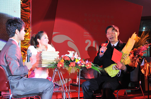 12月26日晚,2010年“我心目中的好老师”暨“大学生年度人物”颁奖典礼隆重举行,校党政领导徐志平、杜卫、陈根芳、周加敏、吕进、赵东福、冯军、郑友取、毛建卫、正校级巡视员胡浙平及各二级BBIN 负责人出席颁奖典礼。 校党委书记徐志平在颁奖典礼开始前作了热情洋溢的讲话。他向获奖的大学生心目中好老师和年度人物表示最热烈的祝贺,也希望全校各级单位和广大师生,以全面建设特色鲜明的高水平应用型大学为目标,以先进典型为榜样,围绕科学发展、创新发展和特色发展,把各项工作落到实处,实现“十二五”发展开好局、起好步。 今年我心目中的好老师和大学生年度人物的主题是“爱与责任•青春力量”。王长荣、卢艺舟、刘士旺、陈军统、易翔宇、胡开堂、段福斌、徐向东、葛丁飞、Ralf Mayenberger(德国)等十位老师以其精湛的教学艺术、对学生的无限关爱和付出而受到同学们的喜爱,最终入选学生心目中的好老师。吴司韩、方肇初、李婷婷、李鑫东、苏雁、金洪峰、赵力波、章艳华、温明圣、裘梦媛等十位同学当选“大学生年度人物”。 本次评选从历经推选、投票、专家评审等各环节,最终评选出十位我心目中的好老师和十位年度人物。