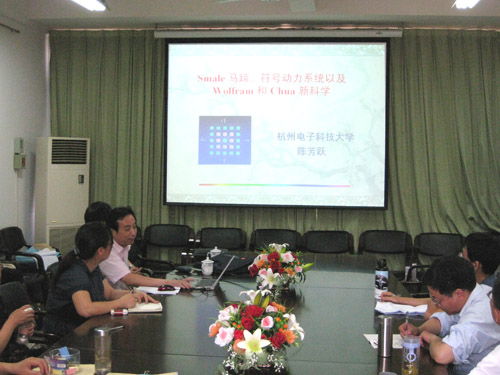 命名仪式结束后,陈芳跃教授为数学与信息科学系教师作了“Smale 马蹄、符号动力系统以及Wolfram 和 Chua 新科学”的学术报告。陈教授的报告体现了他丰富的数学知识和深厚的数学修养,给与会教师留下了深刻的印象。