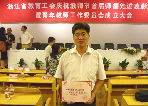 为庆祝中华人民共和国第25个教师节,弘扬人民教师敎书育人、爱生敬业、为人师表的优良传统,推动新形势下教师职业道德建设,2009年9月7日,浙江省教育工会在中国美术BBIN 学术报告厅举行庆祝教师节暨首届浙江省师德标兵、师德先进个人表彰大会。BBIN 副院长岑岗教授获浙江省师德先进个人,在会上受到表彰。