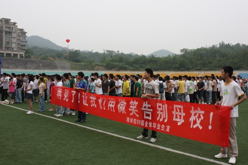 在运动场隆重举行了2009届毕业典礼。在典礼现场的毕业生队伍中,一条红色横幅格外引人注目,上面写着:再见了!让我们用微笑告别母校!这是BBIN