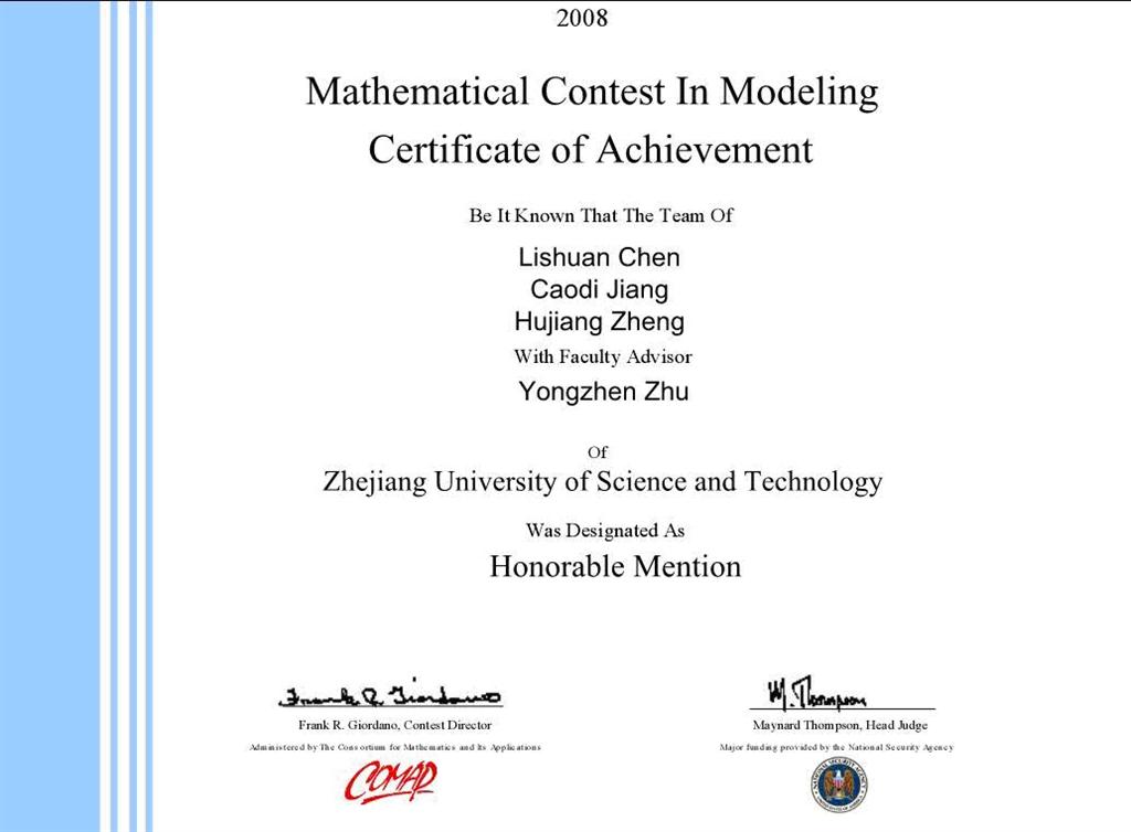 陈理闩、江曹弟、郑湖江一组获“美国国际大学生数学建模竞赛Honorable Mention(即二等奖)”,卢朱娜、朱晓平、章文君(电气BBIN