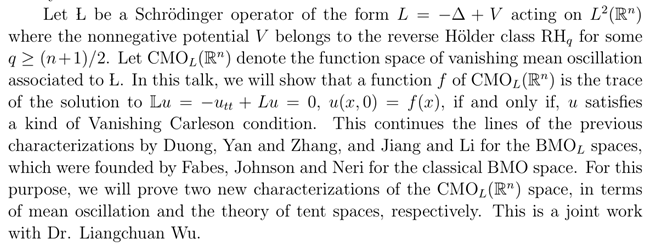 报告题目: Characterizations of CMO spaces associated to Schrodinger operators and their application