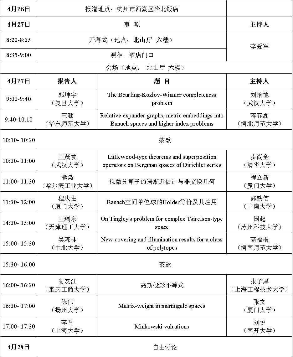 2024年4月26日至4月28日在杭州市华北饭店举办“2024年泛函分析与几何研讨会”,本次会议由BBIN 承办,主要交流Banach空间理论、算子理论与几何及其相关领域的最新研究成果和前沿进展,加强同行间的交流与合作。